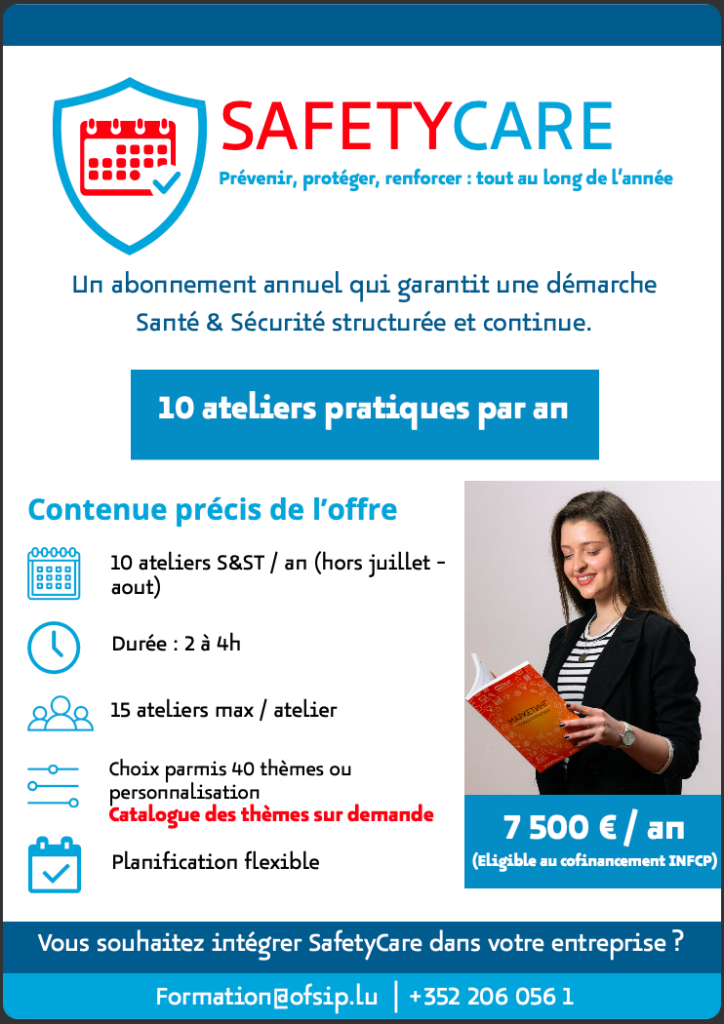 Avec notre abonnement S&ST, vous bénéficiez d’un pack de formations et d’ateliers personnalisés, planifiés sur l’année, pour répondre à toutes vos obligations en matière de santé, sécurité et qualité de vie au travail.